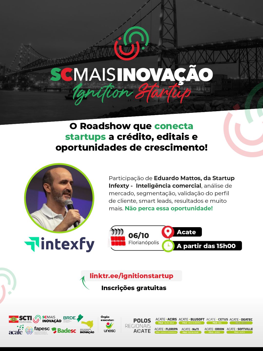 A iniciativa, realizada em parceria com a Acate e a Rede de Centros de Inovação, vai apresentar aproximadamente R$ 20 milhões em linhas de crédito do Badesc, além de editais da Fapesc e espaços de networking que se encerram com um happy hour em cada etapa.